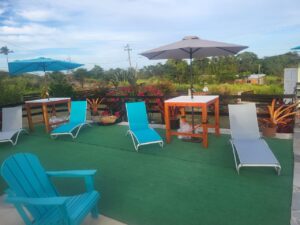 Toco Eco Experience/Palmaires is a five bedroom house that is divided into two apartment blocks, with one apartment upstairs that contains three self-contained bedrooms, a kitchen, and a sky deck. The downstairs apartment comprises of two self-contained bedrooms, a kitchen and a living room.